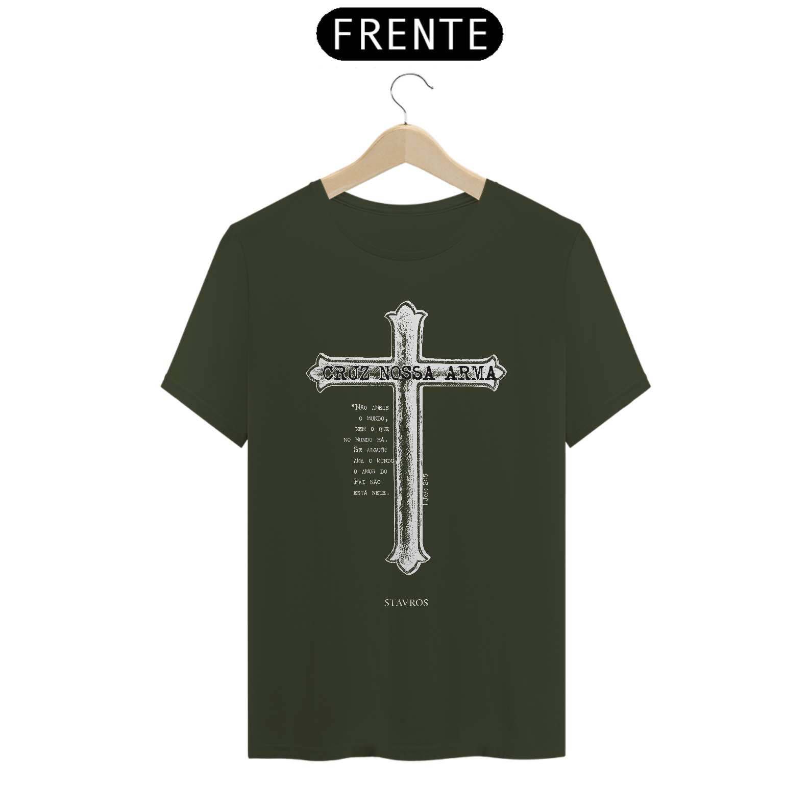 A Camiseta Cruz Nossa Arma da Stavros é um chamado à batalha espiritual, inspirada na passagem bíblica de 1 João 2:15-17: "Não ameis o mundo, nem as coisas que há no mundo. Se alguém ama o mundo, o amor do Pai não está nele." Essa mensagem desafia os cristãos a rejeitarem as seduções passageiras do mundo e se armarem com a verdade e a fé em Cristo.