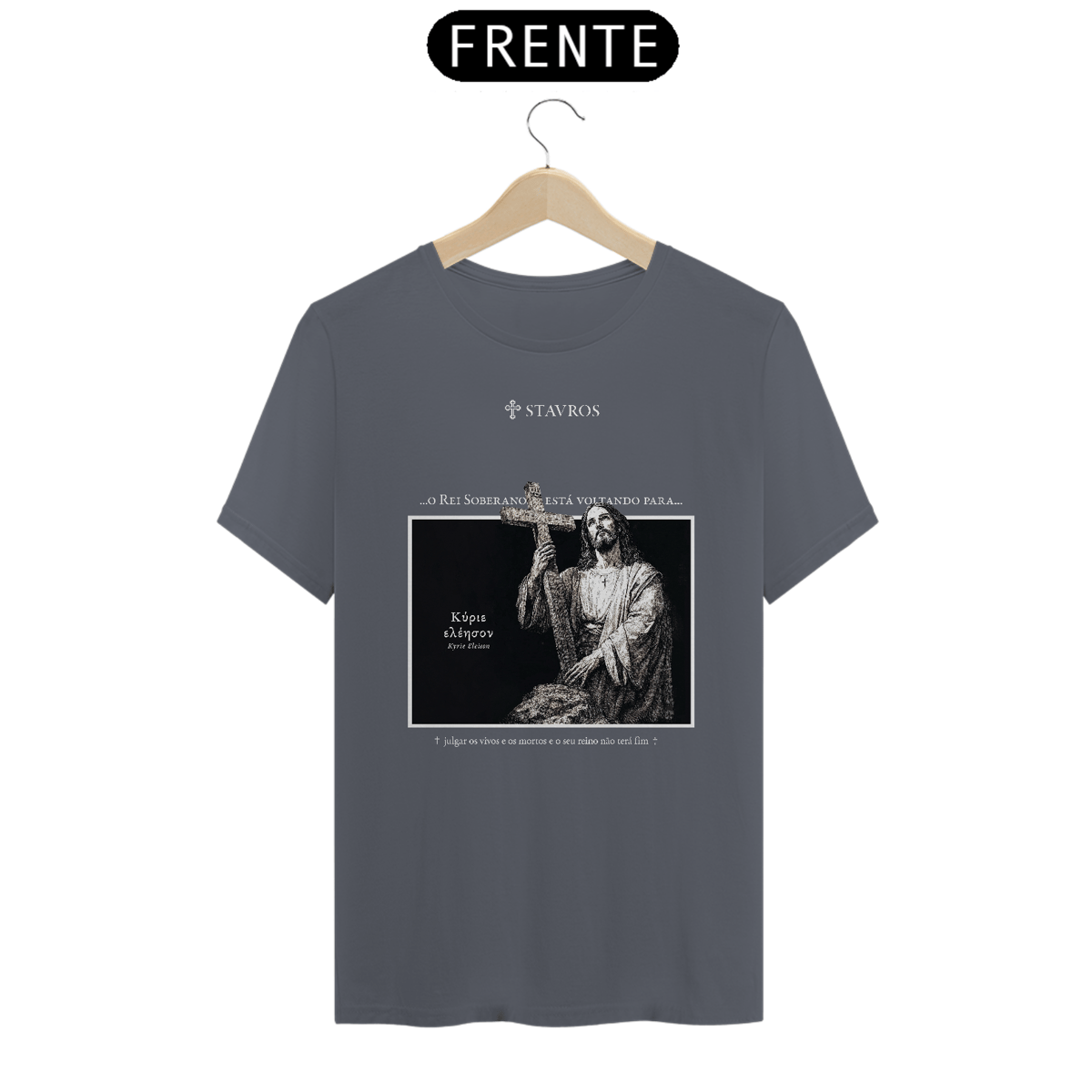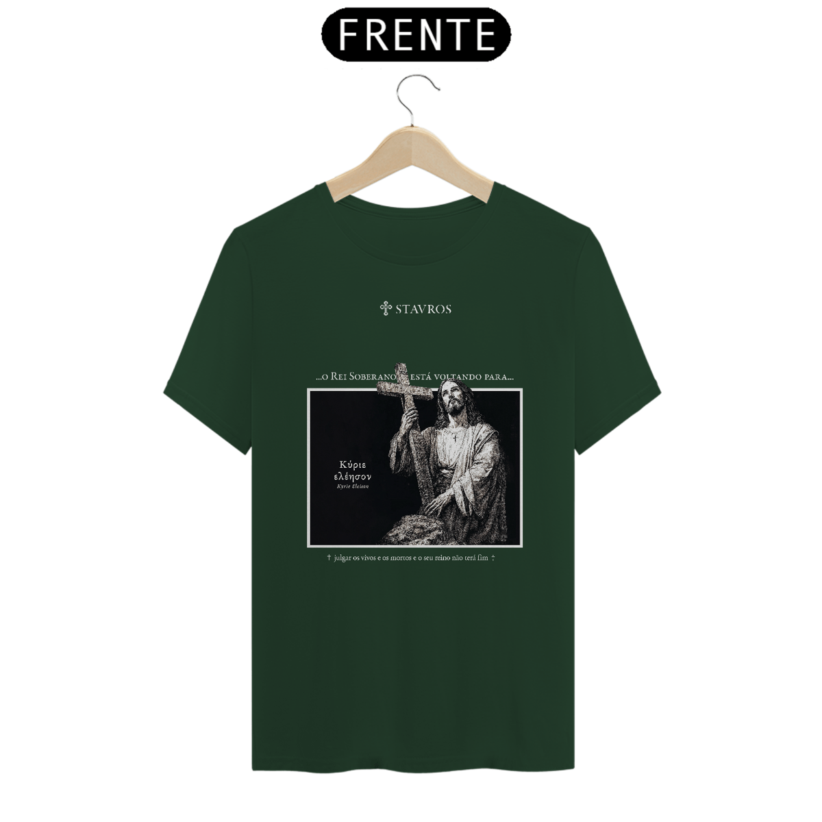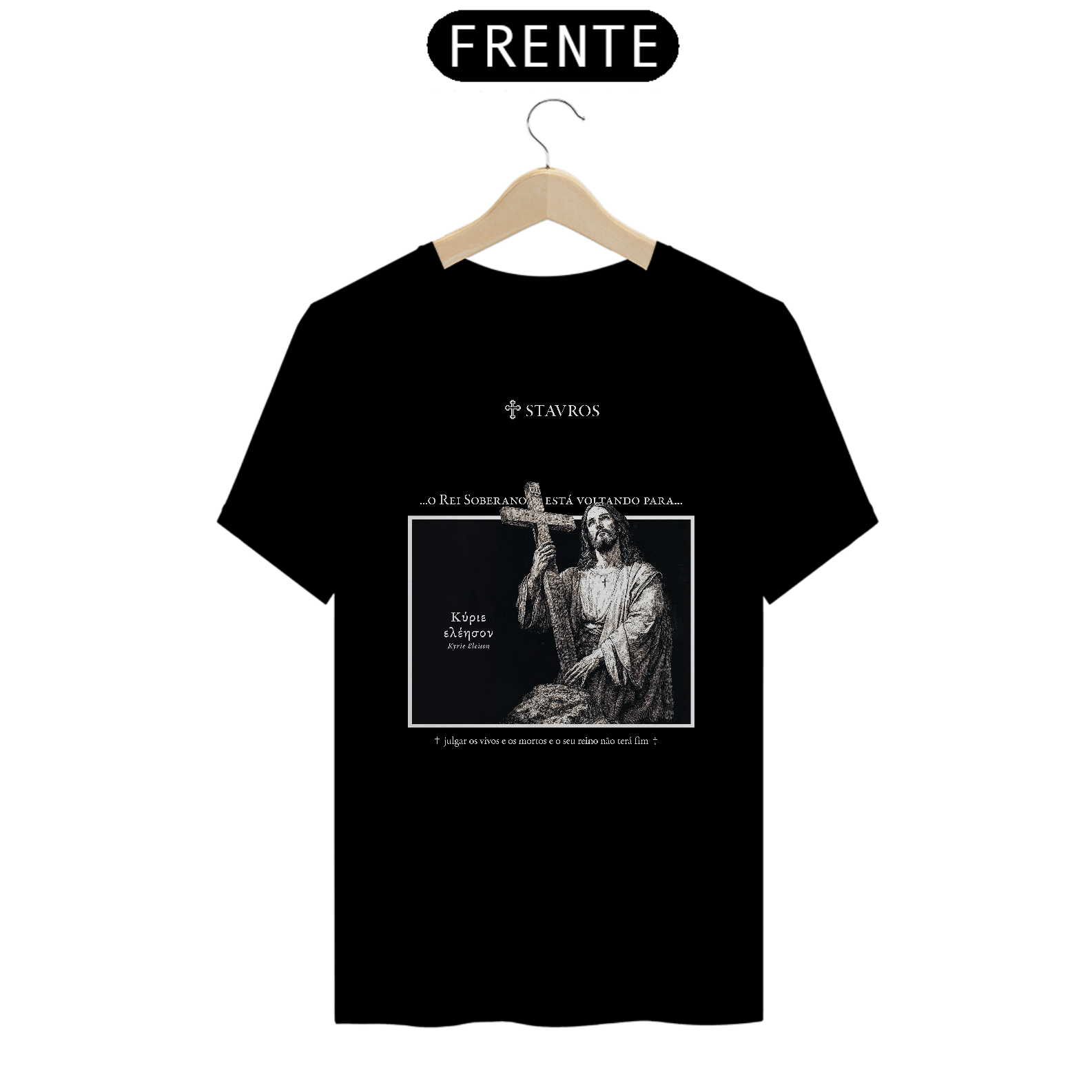 Feita em tecido Pima de alta qualidade, conhecido por sua suavidade e durabilidade, a camiseta oferece um caimento impecável e conforto excepcional. O design valoriza elementos das tradições cristãs e ortodoxas, comunicando poder, devoção e a certeza de que Cristo reina soberano.